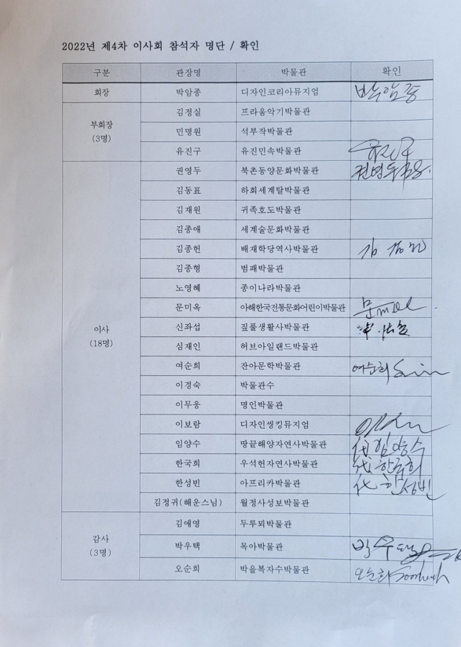 2022년 10월 6일(목) 동묘한옥 성혜헌에서 22명의 이사중 11명의 이사와 감사 2명이 참석한 가운데 (사)한국사립박물관협회 제3차 이사회가 개최되었습니다. 이사 총 22명 중 11명의 참석으로 과반수가 넘었음으로 이사회 개최 정족수가 충족되어 이사회가 성립되었습니다.(감사 오순희, 박우택 확인, 참석자 날인) 전차회의록 확인에 이어 보고안건 2건과 심의안건 2건 총4건에 대해 논의 후 이의없이 모두 의결하였습니다. 오후 5시 10분 회의시작 오후 6시 40분 회의마감.