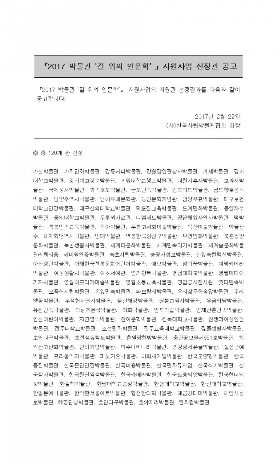 2017 박물관 길 위의 인문학 지원사업 선정관 발표 페이지 정보 작성자 관리자 작성일17-02-22 20:00 조회42,374회 댓글0건 관련링크 이전글 다음글 목록 본문 댓글목록 등록된 댓글이 없습니다. 이전글 다음글 목록