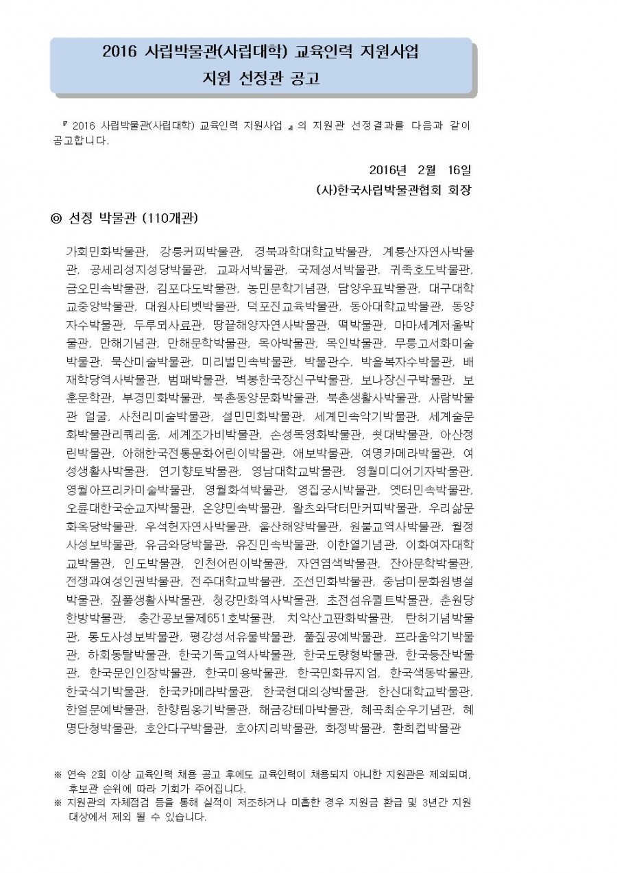 2016 사립박물관(사립대학) 교육인력 지원사업 지원 선정관 공고 페이지 정보 작성자 관리자 작성일16-02-16 19:53 조회42,772회 댓글0건 관련링크 이전글 다음글 목록 본문 댓글목록 등록된 댓글이 없습니다. 이전글 다음글 목록