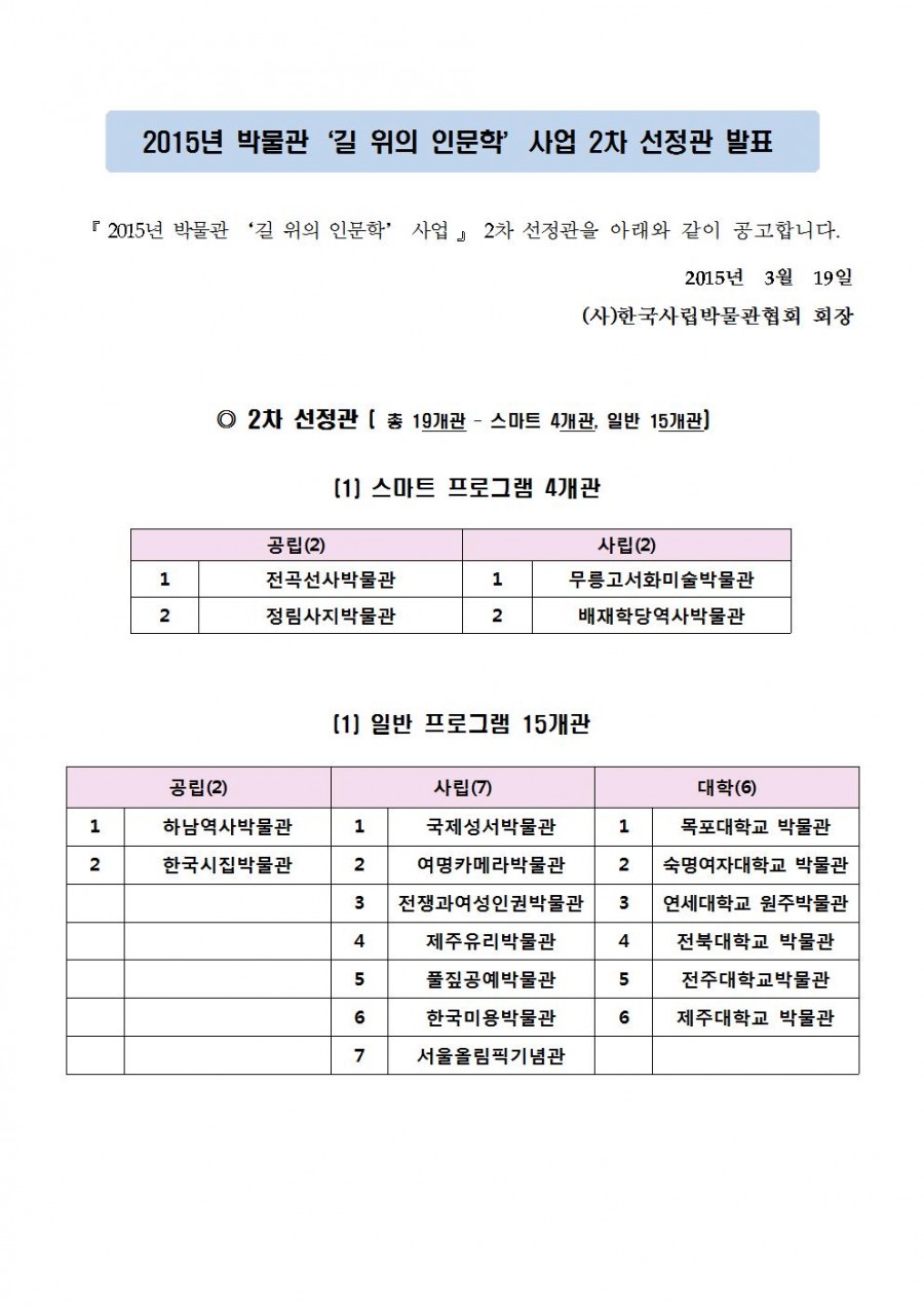 2015 박물관 '길 위의 인문학' 2차 선정관 발표 페이지 정보 작성자 관리자 작성일15-03-19 17:31 조회42,391회 댓글0건 관련링크 이전글 다음글 목록 본문 댓글목록 등록된 댓글이 없습니다. 이전글 다음글 목록